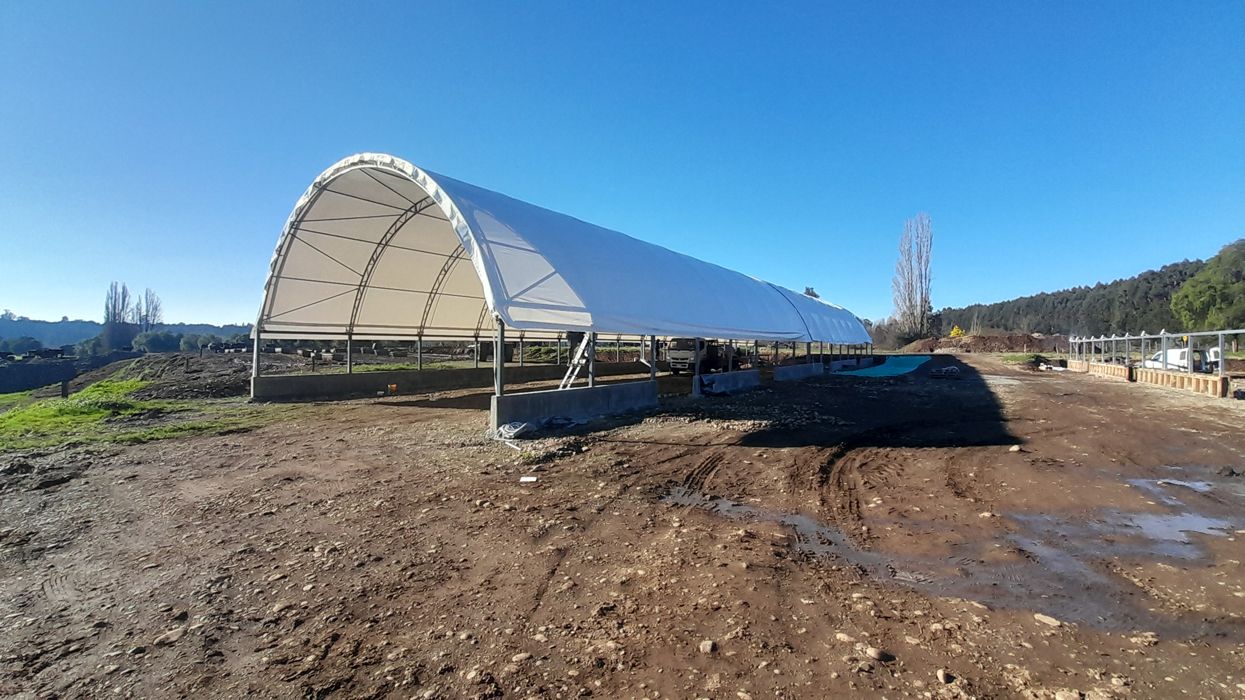 DAPEK.cl es una empresa DPD Constructora SpA. Así, con costo adicional, podemos armar e instalar este tipo de carpas en todo Chile mediante fundaciones de hormigón ó sobre contenedores de 40 pies, incluyendo nivelación de terreno, estructura metálica soportante, ejecución de drenajes y pavimentos, obras civiles. Solución ideal para astilleros, varaderos, bodegas, naves industriales, aserraderos, patios de alimentación ganaderos, plantas de hormigón, estacionamiento de maquinarias, etc. Trabajamos en todo Chile.