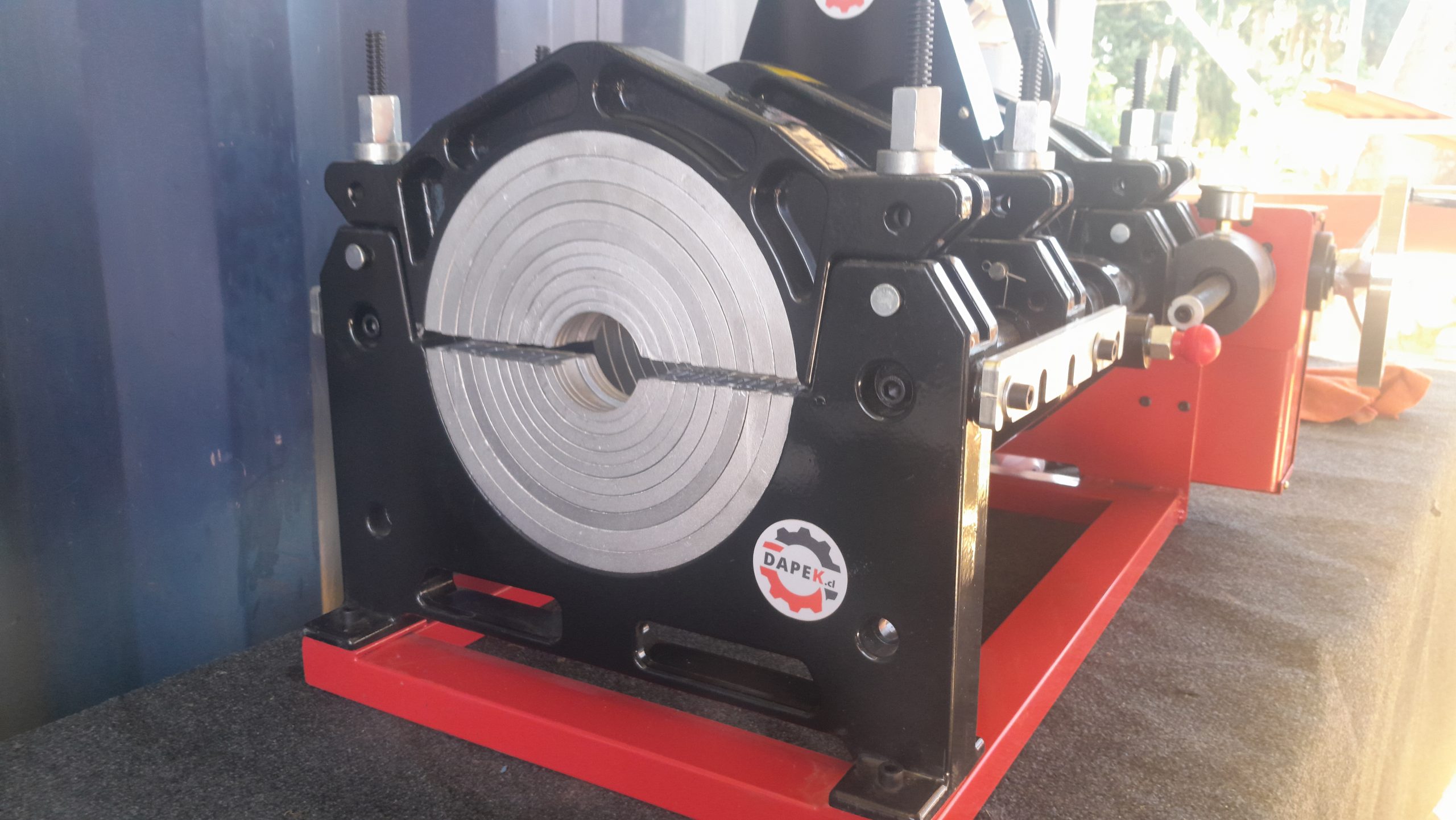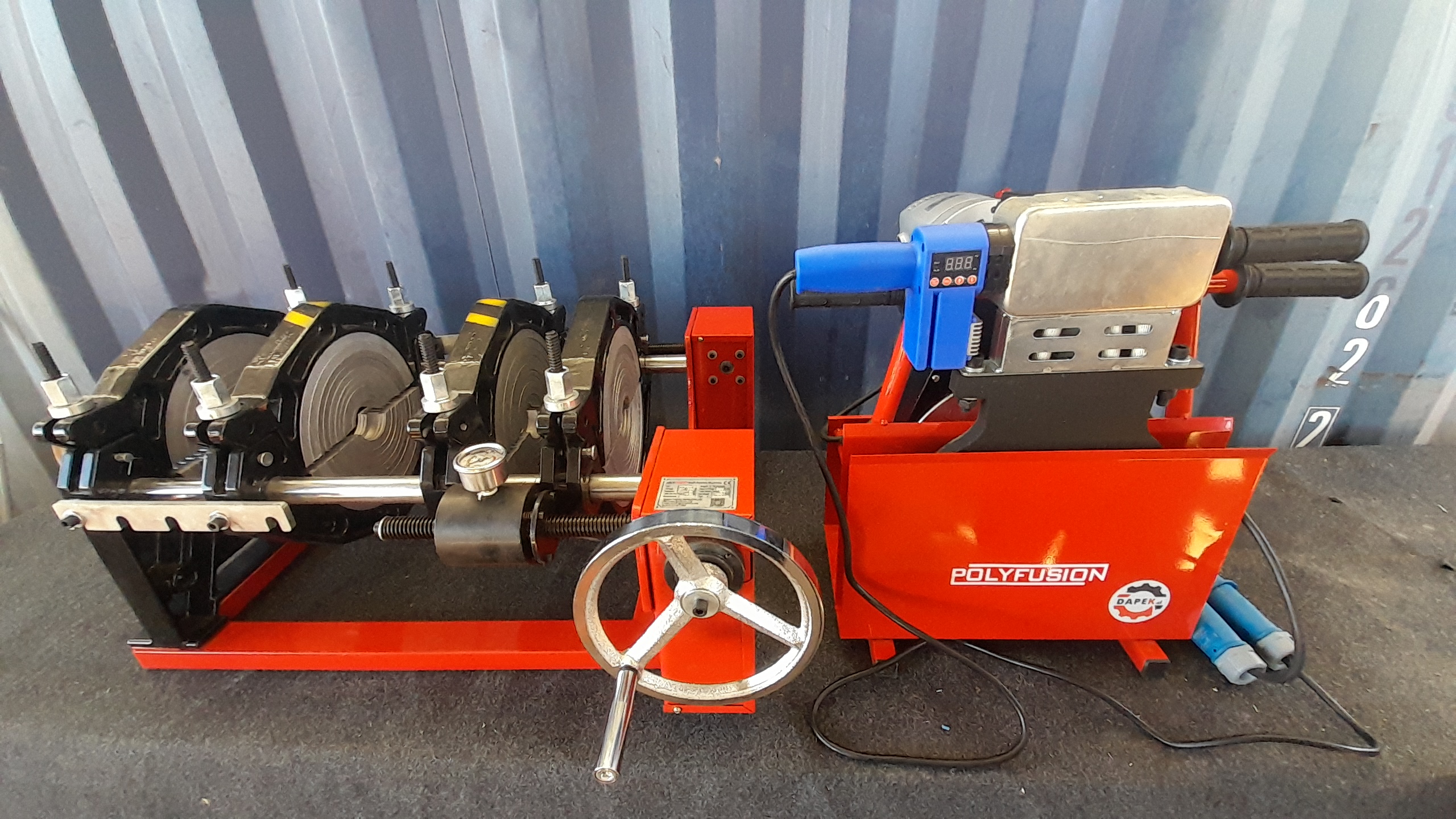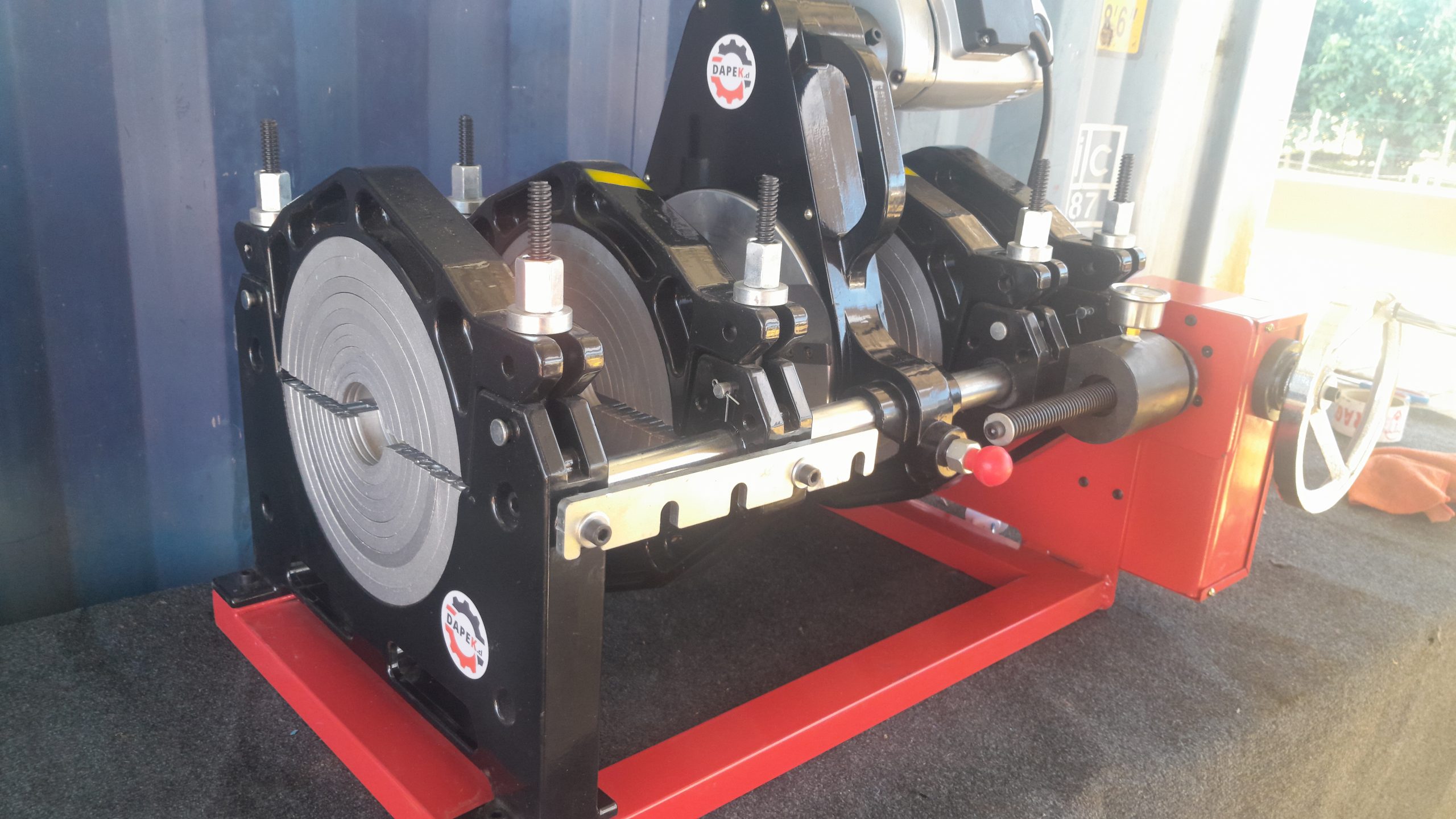 Termofusora manual lineal 4 arcos HDPE 50-250mm Digital DAPEK – POLYFUSION. Una fácilmente tuberías de HDPE con diámetros desde 50 a 250mm. Equipo de fácil uso ideal para espacios reducidos y trabajos preferentemente con tuberías rectas.  Antes de soldar, el refrendador rectifica automáticamente con sus dos cuchillas el borde de ambas tuberías a unir, haciendo que ambas superficies queden completamente alineadas antes de soldarlas con calor. El acercamiento entre ambos extremos de las tuberías se produce de forma manual mediante su manivela y la fuerza ejercida se controla de forma precisa con el manómetro incorporado. Para generar la soldadura, sólo debe ajustar la unidad de calor digital a la temperatura indicada por el fabricante de la tubería, unir mediante la manivela aplicando fuerza y tiempo según tabla de diámetros, respetar el tiempo de enfriamiento y listo, ¡Unión lineal de HDPE resuelta!