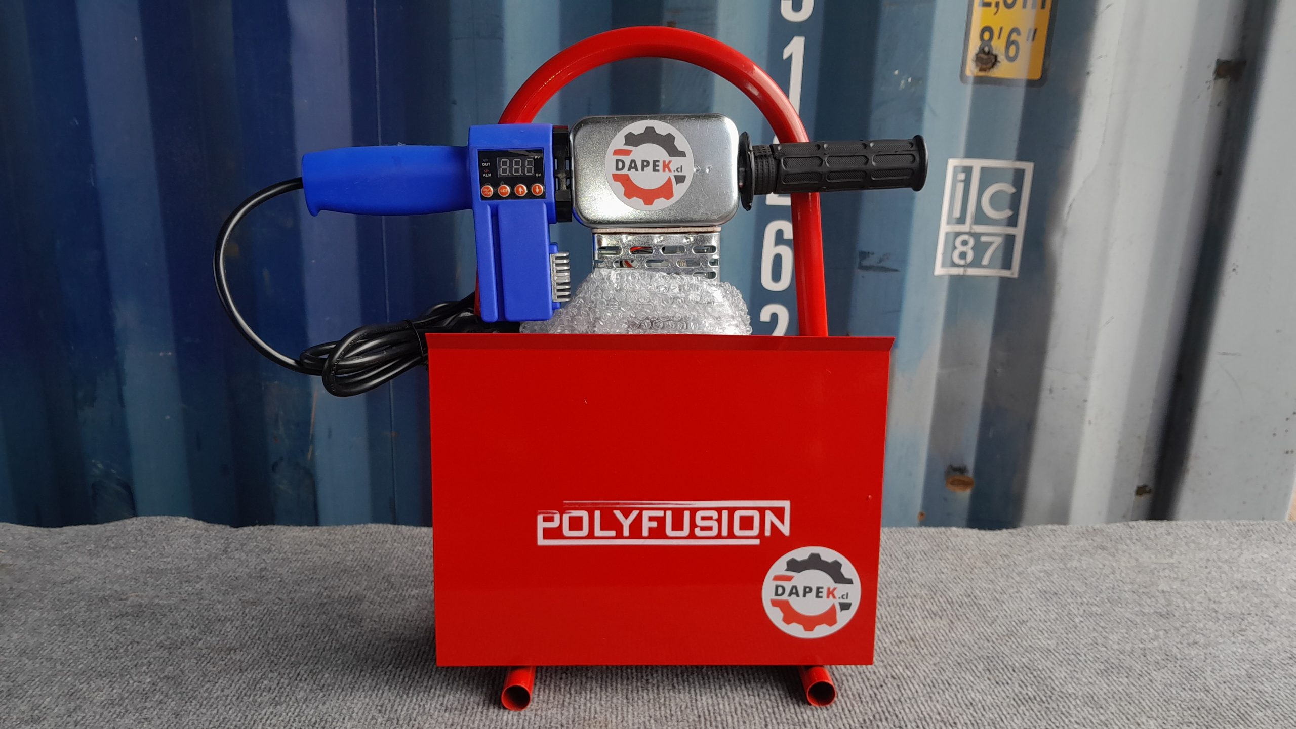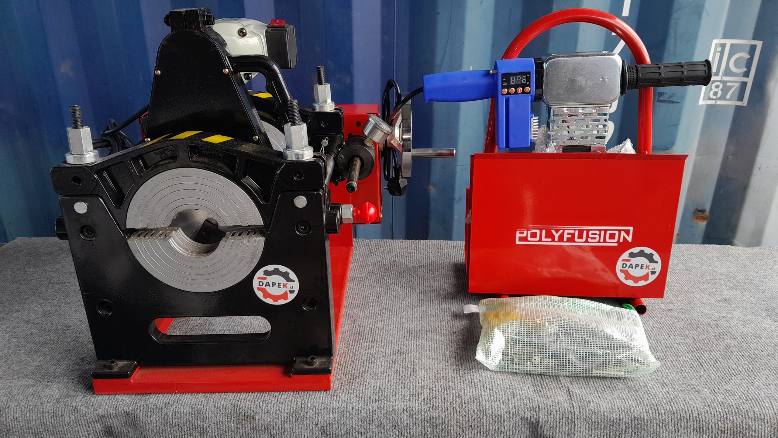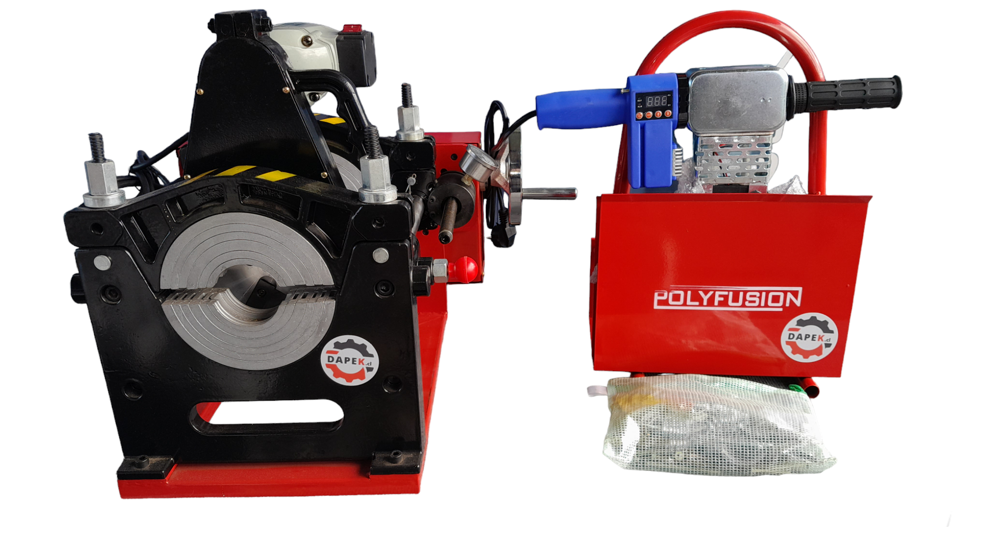Termofusora manual lineal 2 arcos HDPE 40-160mm Digital DAPEK – POLYFUSION. Una fácilmente tuberías de HDPE con diámetros desde 40 a 160mm. Ideal para uso en altura, espacios reducidos, equipo extremadamente liviano que permite hacer reparaciones y poner accesorios en espacios pequeños. No apto para trabajar con tubería enrollada, para ello disponemos de equipos manuales e hidráulicos de 4 arcos. Antes de soldar, el refrentador rectifica automáticamente con sus dos cuchillas el borde de ambas tuberías a unir, haciendo que las superficies estén completamente alineadas antes de soldarlas con calor. El acercamiento entre ambos extremos de las tuberías se produce de forma manual mediante su manivela y la fuerza ejercida se controla con el manómetro incorporado. Para generar la soldadura, sólo debe ajustar la unidad de calor digital a la temperatura indicada por el fabricante de la tubería, unir mediante la manivela, respetar el tiempo de enfriamiento y listo, ¡unión HDPE resuelta!